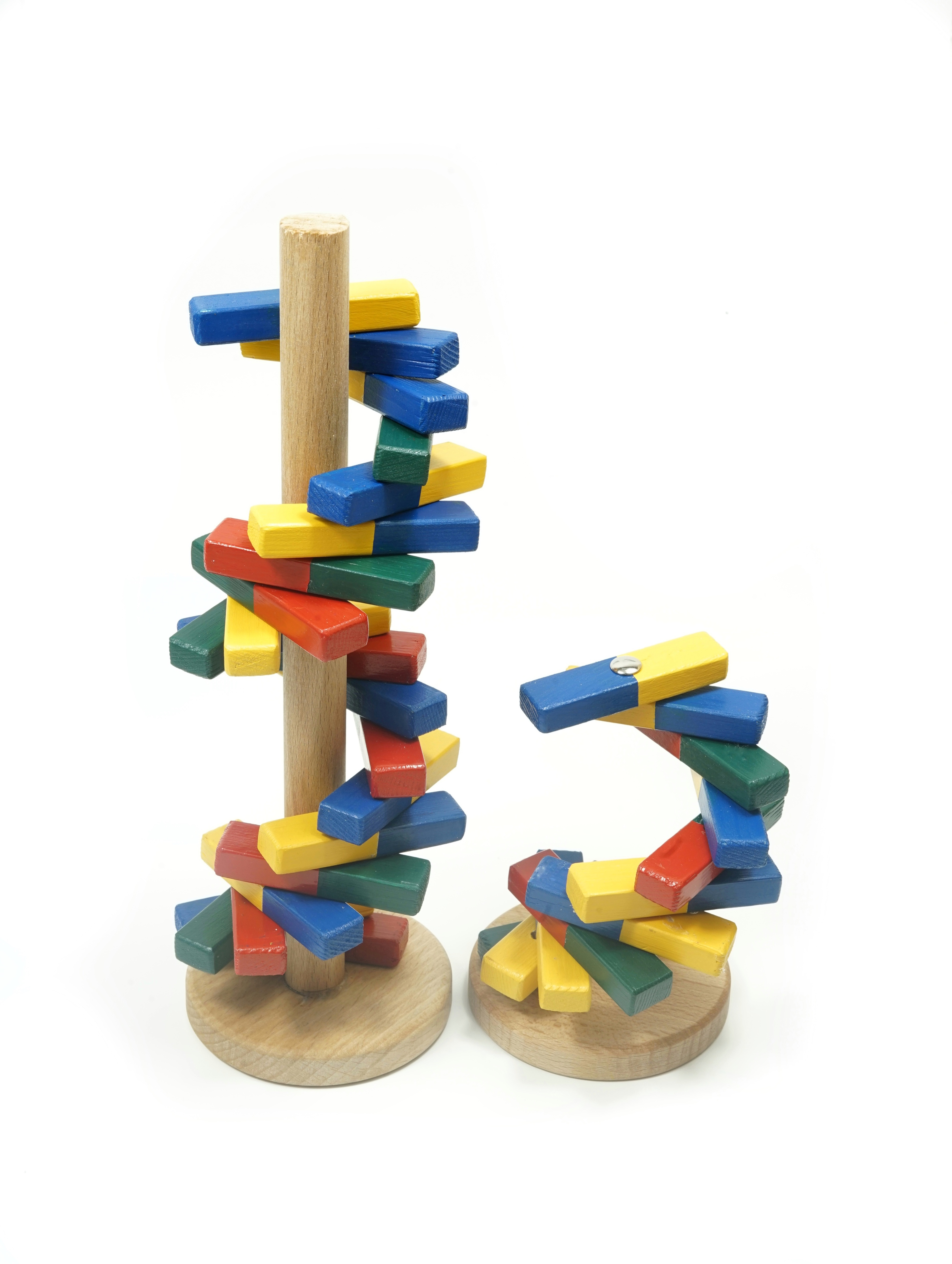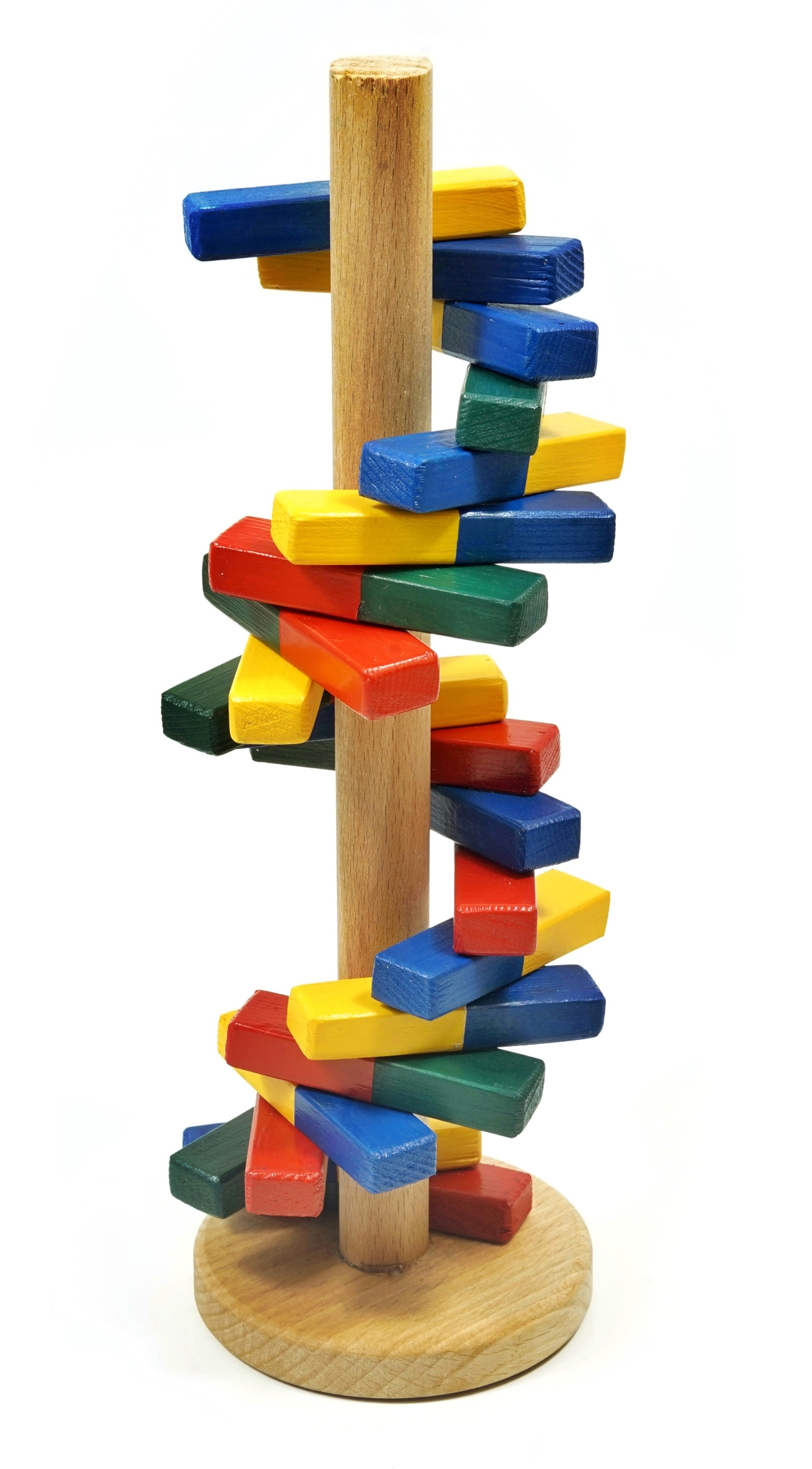 Da die Ebenen jeweils aus einem Basenpaar, also aus zwei unterschiedlichen Basen gebildet werden, sind die Holzstücke zweifarbig. So lässt sich die Kodierung der genetischen Information als Schema darstellen.