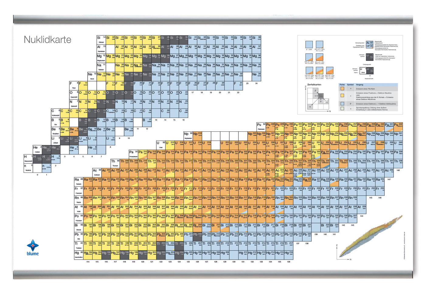 Die blume Nuklidkarte bildet didaktisch optimiert über 3.000 aktuell experimentell nachgewiesene Nuklide ab. Die Karte liefert über 10.000 hoch präzise Daten auf der Basis des renommierten National Nuclear Data Center des Brookhaven Instituts (USA). Für Unterricht, Studium und Forschung in den verschiedenen Fachbereichen liegt der hohe didaktische Wert insbesondere in der lesbarkeitsoptimierten Darstellung der Daten im Zusammenspiel mit dem auf das jeweilige Einsatzgebiet abgestimmten Formats.