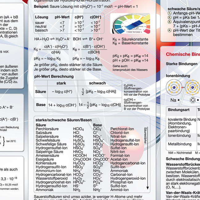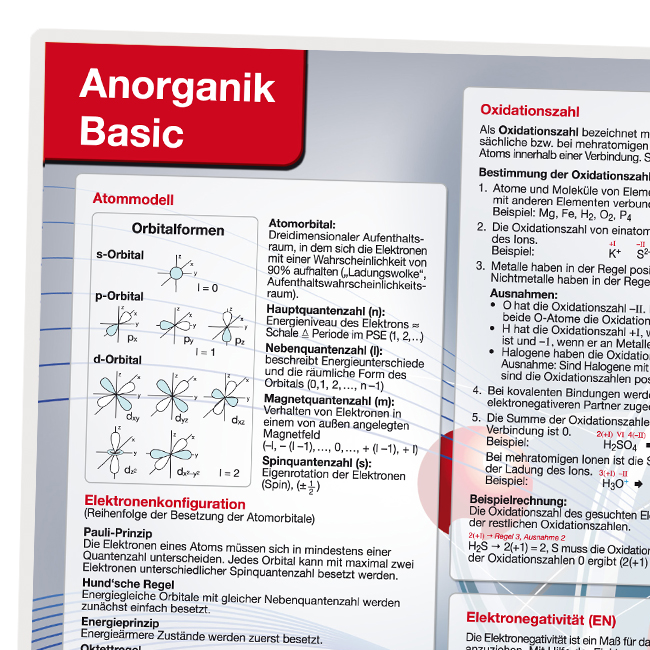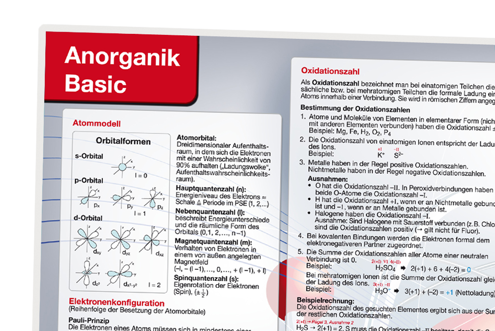 Die Lerntafel Anorganik Basics präsentiert übersichtlich die relevanten Themenfelder der anorganischen Chemie. Durch ihre klare Strukturierung lassen sich Lerninhalte auf einen Blick erfassen. Damit ist die Lerntafel eine hervorragende Ergänzung zum Lehrbuch und ein unverzichtbarer Begleiter durch die Prüfungszeit – im Grundstudium (bei Studienfächern mit Chemie im Nebenfach) und im Abitur (mit Chemie als Leistungsfach). Auch nach der Prüfung behält sie als Erinnerungshilfe ihren Wert.