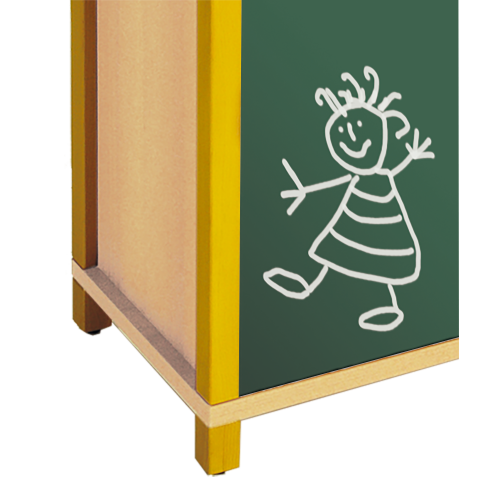 Die Aufdopplung erfolgt mit einem magnetischen, grün emaillierten Blech. Dadurch wird die Rückwand einerseits zum Farbakzent im Raum und andererseits kann sie als Informationsübermittler und Aushangfläche genutzt werden. Und natürlich lassen sich mit Kreide oder abwischbaren Stiften die schönsten Kunstwerke auf die Fläche zaubern...!