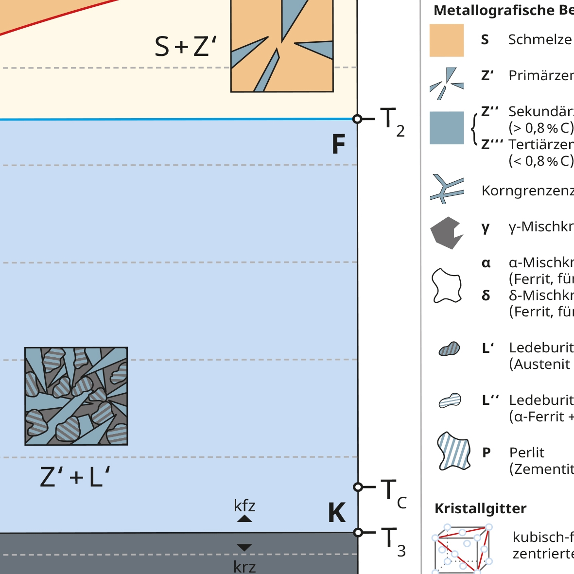 - Metallografische Bezeichnungen und Zusammensetzungen der Mischkristalle und Gefüge werden übersichtlich dargestellt