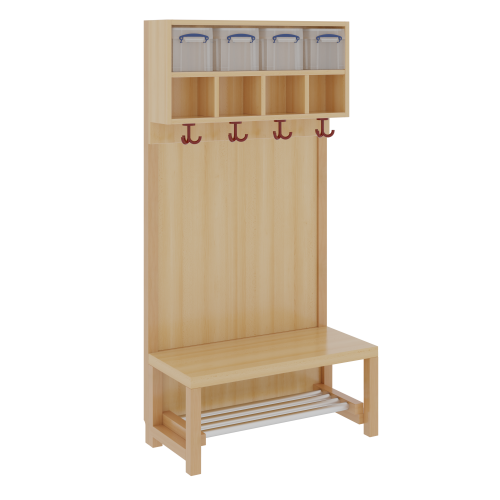 Unsere Komplettgarderoben sind infolge der Fertigung aus lackierten Stützen- und Bankgestellrahmen, 4x4 cm massiven Buche-Holzstollen sehr robust und dauerhaft. Die Garderobenstützen haben wandseitig eine Ausklinkung für Sockelleisten. Zwischen den Garderobenstützen ist flächig eine Paneelrückwand (mit wählbarem Dekor) montiert. In den doppelten Fachablagen aus melaminbeschichteter Spanplatte stehen oben Boxen mit Deckel, darunter steht ein 15 cm hohes Fach zur Verfügung. Unter der Fachablage sind in Anzahl der Plätze farbige drehbare Dreifachhaken montiert. Die Sitzfläche besteht ebenfalls aus stabiler melaminbeschichteter Spanplatte, das Dekor ist wählbar. Darunter befindet sich ein Schuhrost aus mit RAL 9006 pulverbeschichteten robusten Aluminiumrohren.