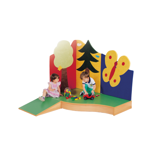 Die 2 mm - ABS Sicherheitskanten an der Podestplatte aus 19 mm E 1-Feinspanplatte gewährleistet eine beanspruchungsfähige Kante, die den täglichen Beanspruchungen auch auf den geschwungenen Konturen ohne weiteres standhält. Der Oberplattenbelag besitzt eine strapazierfähige und pflegeleichte Oberfläche, er besteht aus geräuschdämmendem Linoleum und ist kratzfest, abwisch- und desinfizierbar, die Linoleumfarbe ist aus mehreren fröhlichen Farben wählbar. Das Dekor des Podestkorpus wird ebenfalls in mehreren Varianten angeboten: bitte wählen Sie bei der Bestellung!