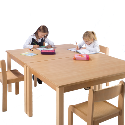 Beine und Zargenrahmen dieser Tische sind aus massivem Buchenholz gefertigt. Die rechteckigen Tischplatten sind 19 mm stark und beidseitig mit Schichtstoff belegt, die Kante besteht aus einem tonnenförmig gerundeten Buche-Massivholzeinleimer. Die sehr widerstands- und strapazierfähige Beschichtung eignet sich hervorragend für den Einsatz im Kindergartenbereich.