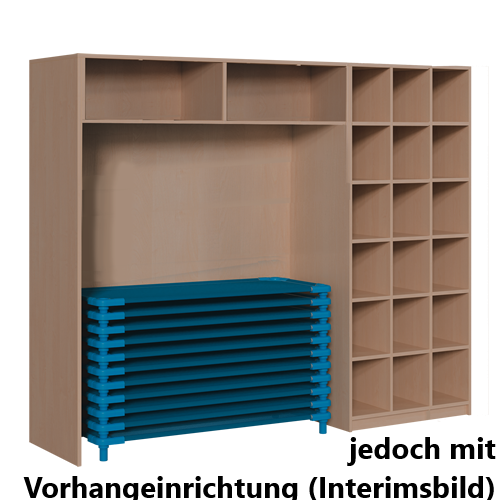 Bis zu 20 Kinderliegen lassen sich in dem Regal unterbringen. Und das Praktische dabei: das Bettzeug lagert gleich in Reichweite. 20 hygienisch getrennte Fächer sind dafür vorgesehen. Das Korpusdekor können Sie nach unserem Dekorangebot wählen. Der Korpus in 60 cm Tiefe wird durch eine um 7 cm nach vorn überstehende Blende mit einer Vorhangeinrichtung erweitert. Der Vorhang verleiht dem Möbel eine ruhige gleichmäßige Frontansicht und zugleich einen schnellen Zugriff auf den gesamten Inhalt.