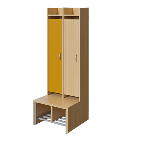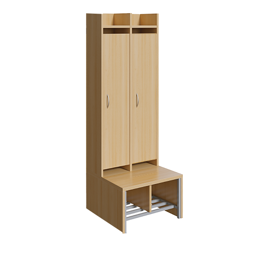 Die getrennte Aufbewahrung der persönlichen Gegenstände ist in allen Ebenen gegeben. In der Spindgarderobe sind alle Wechselsachen des Tages übersichtlich und strukturiert aufgehoben. Die einzelnen Fachmaße B/H/T sind: Ablage 25 x 10 x 23 cm, kleines Fach 25 x 31 x 23 cm und Jackenfach 25 x 81 x 23 cm hinter hoher Tür. Das Dekor der Spindgarderobe ist wählbar, ebenso die Farbe der 3fach-Haken oben im Jackenfach. Die Tür besitzt Lüftungsschlitze und einen Bogengriff, die Öffnungsrichtung ist wählbar. Das Schuhwerk wird auf dem mit RAL 9006 - weißaluminium pulverbeschichteten Schuhrost trocken aufbewahrt, Bodenfreiheit 7 cm. Fachmaße B/H/T: 25 x 22 x 53 cm, Sitztiefe 30 cm