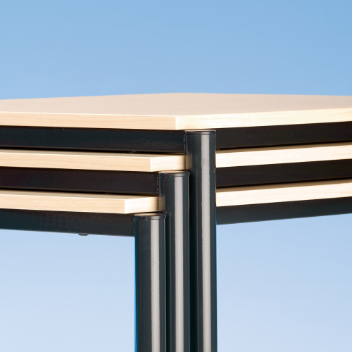 Tischbeine aus einem 40 mm Stahlrundrohr und eine fest verschweißte Zarge nehmen die Tischplatte stabil auf. Unterhalb der Zarge ist ein Stapelschutz angebracht, der beim Aufstapeln der Tische die untere Tischplatte schont.