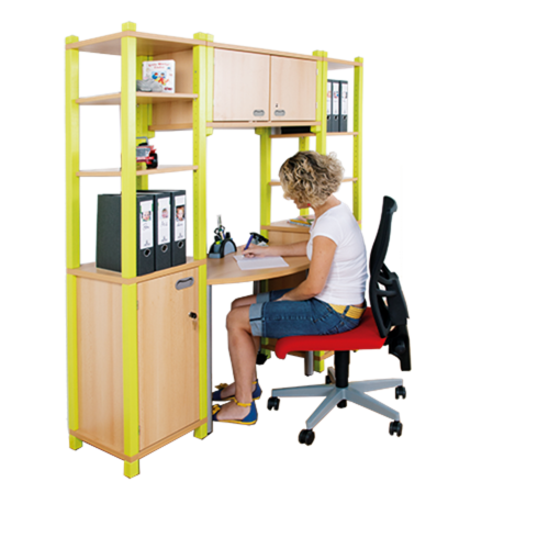 Produktinformationen "Stollen-Erzieherarbeitsplatz B/H/T: 162x180x40/50 cm, rechts und links Regal mit Tür, oben 2 Türen"