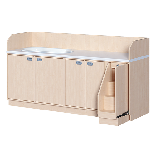 Ob als einzeln aufgestellter Wickelschrank oder als große Wickelkombination - in jedem Fall bieten die verschiedenen Elemente der Wickelkommoden langlebige Materialien, geprüfte Sicherheit, ergonomische Maße und zudem viel Stauraum. Dreiseitige Sicherheits-Aufkantungen umranden die Arbeitsplatte, die vorn benutzerfreundlich gerundet ist und über eine beschichtete und damit wasserabweisende Oberfläche mit zusätzlichen antibakteriellen Eigenschaften verfügt. Eingelassene Griffe und der zurückgesetzte Sockel gestatten ein nahes Herantreten an den Wickelplatz. Als Ausstattungen sind verschiedene Varianten rückenschonender Aufstiegshilfen, Schübe, sowie Kinderbadewannen und Handwaschbecken erhältlich. Optional ist eine besonders wasserfeste Sockelvariante lieferbar. Es kann zwischen zwei verschiedenen Arbeitstiefen und Rechts/Links-Varianten der Schränke gewählt werden. Die Belastbarkeit beträgt bis zu 75 kg. Die Wickelauflage ist separat zu bestellen (Art.Nr. "WIC P..." in der jeweiligen Breite und Tiefe). Ebenso ist bei der Bestellung die gewünschte Ausführung der Einhebel-Mischbatterie - schwenkbare oder herausnehmbare Ausführung - (Art.Nr. "KG 02...") zusätzlich zu vermerken.