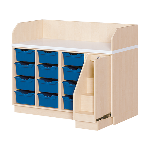 Ob als einzeln aufgestellter Wickelschrank oder als große Wickelkombination - in jedem Fall bieten die verschiedenen Elemente der Wickelkommoden langlebige Materialien, geprüfte Sicherheit, ergonomische Maße und zudem viel Stauraum. Dreiseitige Sicherheits-Aufkantungen umranden die Arbeitsplatte, die vorn benutzerfreundlich gerundet ist und über eine beschichtete und damit wasserabweisende Oberfläche mit zusätzlichen antibakteriellen Eigenschaften verfügt. Eingelassene Griffe und der zurückgesetzte Sockel gestatten ein nahes Herantreten an den Wickelplatz. Als Ausstattungen sind verschiedene Varianten rückenschonender Aufstiegshilfen, Schübe, sowie Kinderbadewannen und Handwaschbecken erhältlich. Optional ist eine besonders wasserfeste Sockelvariante lieferbar. Es kann zwischen zwei verschiedenen Arbeitstiefen und Rechts/Links-Varianten der Schränke gewählt werden. Die Belastbarkeit beträgt bis zu 75 kg. Die Wickelauflage ist separat zu bestellen (Art.Nr. "WIC P..." in der jeweiligen Breite und Tiefe).