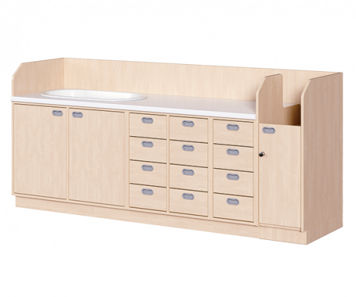 Ob als einzeln aufgestellter Wickelschrank oder als große Wickelkombination - in jedem Fall bieten die verschiedenen Elemente der Wickelkommoden langlebige Materialien, geprüfte Sicherheit, ergonomische Maße und zudem viel Stauraum. Dreiseitige Sicherheits-Aufkantungen umranden die Arbeitsplatte, die vorn benutzerfreundlich gerundet ist und über eine beschichtete und damit wasserabweisende Oberfläche mit zusätzlichen antibakteriellen Eigenschaften verfügt. Eingelassene Griffe und der zurückgesetzte Sockel gestatten ein nahes Herantreten an den Wickelplatz. Als Ausstattungen sind verschiedene Varianten rückenschonender Aufstiegshilfen, Schübe, sowie Kinderbadewannen und Handwaschbecken erhältlich. Optional ist eine besonders wasserfeste Sockelvariante lieferbar. Es kann zwischen zwei verschiedenen Arbeitstiefen und Rechts/Links-Varianten der Schränke gewählt werden. Die Belastbarkeit beträgt bis zu 75 kg. Die Wickelauflage ist separat zu bestellen (Art.Nr. "WIC P..." in der jeweiligen Breite und Tiefe). Ebenso ist bei der Bestellung die gewünschte Ausführung der Einhebel-Mischbatterie - schwenkbare oder herausnehmbare Ausführung - (Art.Nr. "KG 02...") zusätzlich zu vermerken.