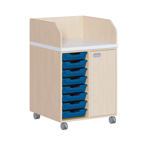 Neben der flexiblen Einsetzbarkeit zeichnen sich die fahrbaren Wickelkommoden zudem durch langlebige Materialien, geprüfte Sicherheit, ergonomische Maße und viel Stauraum aus. Dreiseitige Sicherheits-Aufkantungen umranden die Arbeitsplatte, die vorn benutzerfreundlich gerundet ist und über eine beschichtete und damit wasserabweisende Oberfläche mit zusätzlichen antibakteriellen Eigenschaften verfügt. Eingelassene Griffe und hohe Rollen gestatten ein nahes Herantreten an die Kommode. Als Ausstattungen sind Schübe, Türen und Regale erhältlich. Es kann zwischen verschiedenen Arbeitstiefen und Rechts/Links-Varianten gewählt werden. Die Belastbarkeit beträgt bis zu 75 kg. Die Wickelauflage ist separat zu bestellen (Art.Nr. "WIC P..." in der jeweiligen Breite und Tiefe).